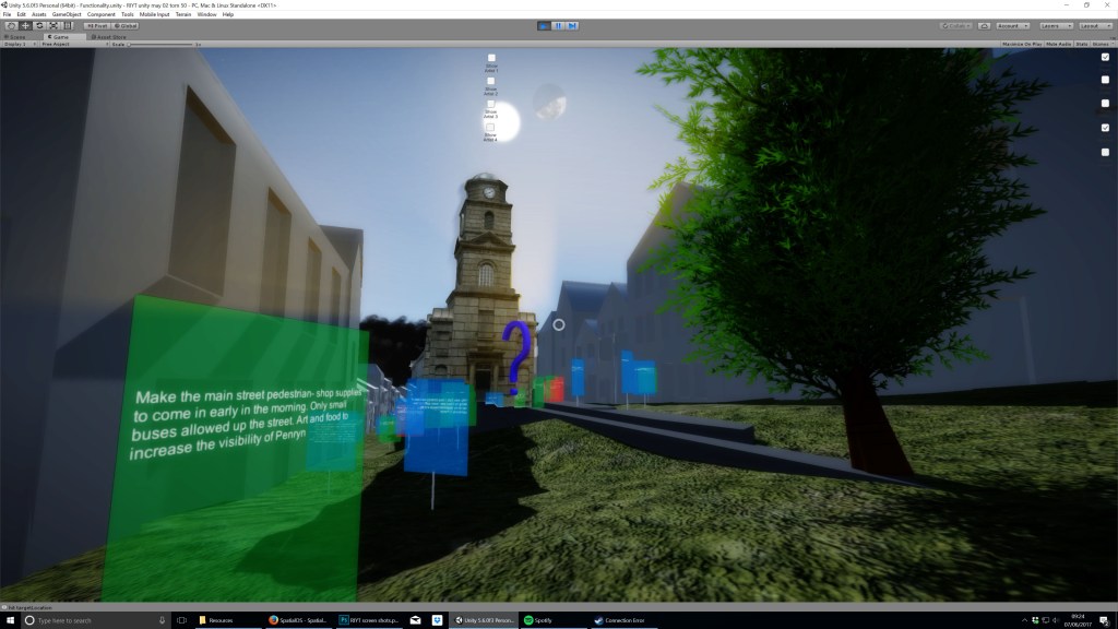 The digital map began as a 3D, scaled representation of Penryn but without any architectural features. Outcomes from the different workshops were then integrated, according to location, into the map